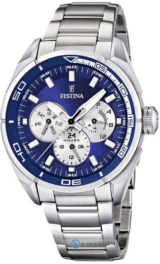 Zegarek męski F16608-3 marki Festina to stylowe połączenie funkcjonalności oraz modnego designu. Model ten jest z serii Festina Sport. Wysokiej jakości tarczę zegarka ozdobiono niebieskim kolorem. Pokazana metodą analogową aktualna godzina jest czytelna i szybka do odczytania. Koperta została ozdobiona kolorem srebrnym szeroka jest na 44 mm oraz ma grubość 12 mm - wyróżnia się okrągłym kształtem.