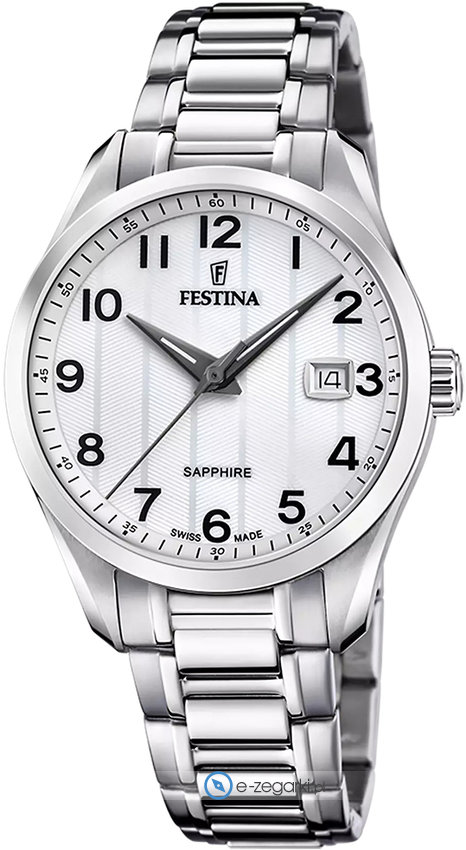 Męski zegarek F20026-1 z serii Festina Swiss Made marki Festina to połączenie smaku i oryginalnych funkcji. Charakter zapewnia wysokiej klasy tarcza w kolorze białym. Aktualna godzina prezentowana jest w sposób analogowy co bez trudu pozwala ją odczytać. Koperta jest ozdobiona kolorem srebrnym szeroka jest na 38 mm oraz ma grubość 9 mm - charakteryzuje się okrągłym kształtem.
