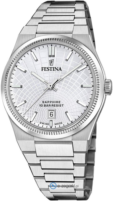 Zegarek męski F20051-1 marki Festina to dobre połączenie funkcjonalności i ciekawego designu. Model ten należy do serii Festina Swiss Made. Wysokiej trwałości cyferblat zegarka pokryto srebrnym kolorem. Godzina pokazywana jest w sposób analogowy co bez trudu pozwala ją odczytać. Koperta w odcieniach koloru srebrnego szeroka jest na 40 mm oraz ma grubość 9 mm - ma okrągły kształt.
