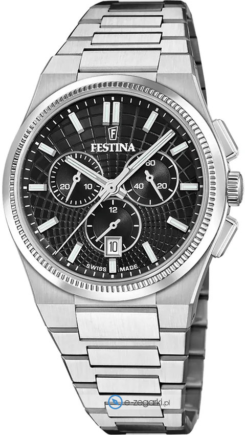 Zegarek F20059-4 marki Festina to gustowny zegarek naręczny męski, który wyposażono w pomysłowe rozwiązania i funkcje. Model ten należy do serii Festina Swiss Made. Wysokiej jakości cyferblat zegarka ozdobiono czarnym kolorem. Aktualna godzina zaprezentowana jest w sposób analogowy co niezmiernie łatwo pozwala ją odczytać. Koperta jest pokryta kolorem srebrnym szeroka jest na 42 mm oraz ma grubość 12 mm - cechuje się okrągłym kształtem.