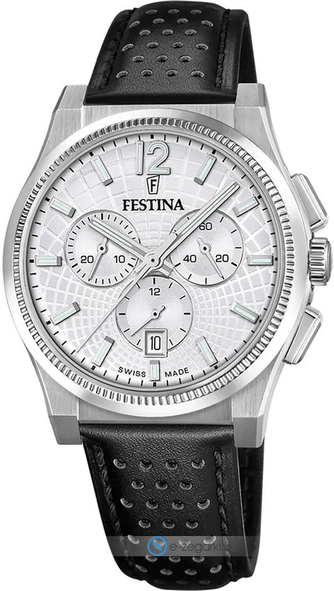 Zegarek F20060-1 marki Festina to gustowny zegarek naręczny męski, który wyposażono w pomysłowe rozwiązania oraz funkcje. Model ten jest z kolekcji Festina Swiss Made. Wysokiej trwałości cyferblat zegarka pokryto białym kolorem. Godzina zaprezentowana jest w sposób analogowy co intuicyjnie pozwala ją odczytać. Koperta jest pokryta kolorem srebrnym szeroka jest na 42 mm oraz ma grubość 12 mm - charakteryzuje się okrągłym kształtem.