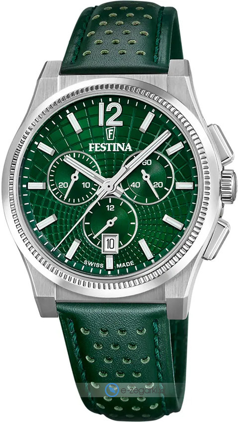 Zegarek F20060-3 marki Festina to elegancki zegarek naręczny męski, który wyposażono w ciekawe rozwiązania oraz funkcje. Model ten jest z serii Festina Swiss Made. Cyferblat zegarka jest w kolorze zielonym. Zegarek ten pokazuje godzinę w formacie analogowym dzięki czemu odczyt jest bezproblemowy. Koperta w barwach koloru srebrnego szeroka jest na 42 mm oraz ma grubość 12 mm - ma okrągły kształt.