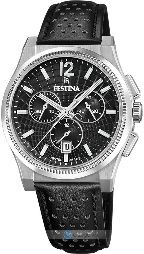 Męski zegarek F20060-4 z kolekcji Festina Swiss Made marki Festina to połączenie stylu oraz nieprzeciętnych funkcji. Atrakcyjny wygląd zegarka osiągnięto również dzięki tarczy w kolorze czarnym. Zaprezentowana metodą analogową aktualna godzina jest czytelna i szybka do sprawdzenia. Koperta jest w kolorze srebrnym szeroka jest na 42 mm oraz ma grubość 12 mm - ma okrągły kształt.