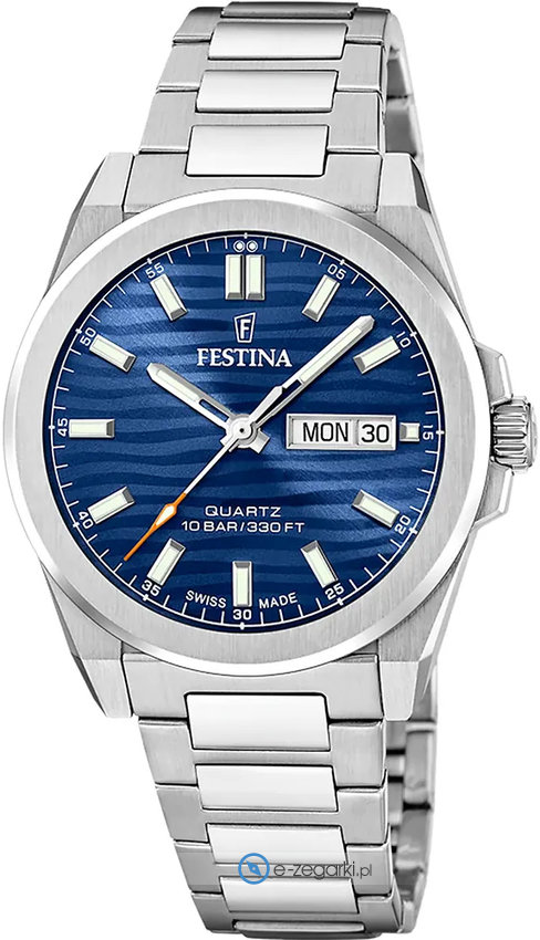 Festina F20073-3 - męski zegarek przeznaczony dla osób szukających zegarka z rodziny Festina Swiss Made. Wysokiej trwałości cyferblat zegarka pokryto niebieskim kolorem. Pokazana metodą analogową aktualna godzina jest czytelna i szybka do sprawdzenia. Koperta jest pokryta kolorem srebrnym szeroka jest na 39 mm oraz ma grubość 11 mm - cechuje się okrągłym kształtem.