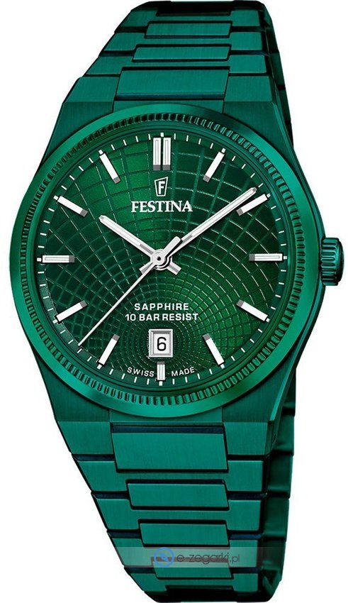 Model męski F20079-1 marki Festina należy do rodziny Festina Swiss Made. Ciekawą budowę czasomierza osiągnięto dzięki tarczy w kolorze zielonym. Zegarek ten prezentuje aktualny czas w formacie analogowym dzięki temu odczyt jest bardzo łatwy. Koperta jest ozdobiona kolorem zielonym szeroka jest na 40 mm oraz ma grubość 9 mm - ma okrągły kształt.
