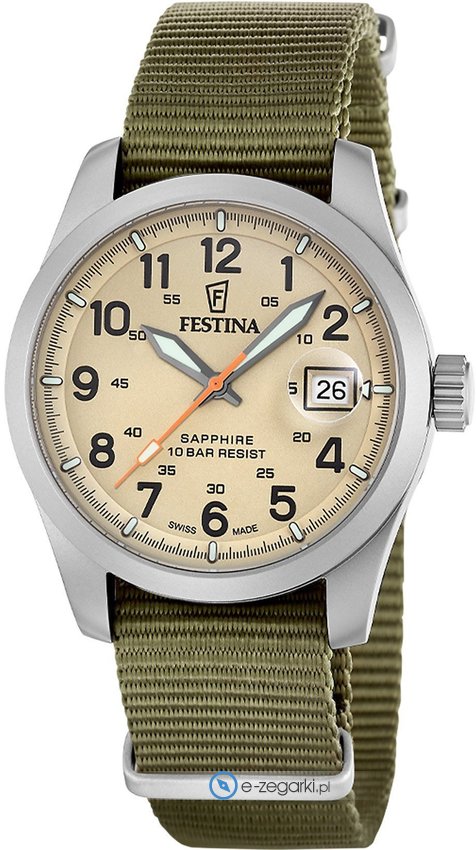 Męski zegarek F20082-1 z kolekcji Festina Swiss Made marki Festina to połączenie estetyki oraz oryginalnych mechanizmów. Wysokiej trwałości cyferblat zegarka pokryto beżowym kolorem. Aktualna godzina prezentowana jest w sposób analogowy co bez trudu pozwala ją odczytać. Koperta została pokryta kolorem srebrnym szeroka jest na 39 mm oraz ma grubość 9 mm - w kształcie okrągłym.