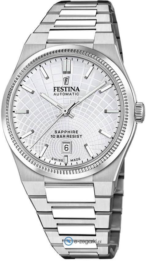 Zegarek męski F20083-1 marki Festina należy do kolekcji Festina Swiss Made. Atrakcyjną budowę czasomierza osiągnięto z pomocą tarczy w kolorze srebrnym. Aktualna godzina zaprezentowana jest w sposób analogowy co bez trudu pozwala ją odczytać. Koperta w barwach koloru srebrnego szeroka jest na 40 mm oraz ma grubość 11 mm - posiada okrągły kształt.