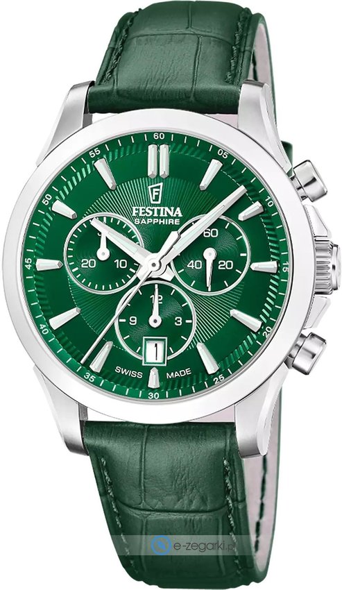 Męski zegarek F20094-4 z kolekcji Festina Swiss Made to propozycja dla mężczyzn ceniących połączenie klasycznego stylu z nutą sportowego charakteru. Ten szwajcarski czasomierz łączy w sobie elegancję i funkcjonalność. Zielona tarcza, prezentująca czas w formacie analogowym, jest niezwykle czytelna. Srebrna koperta o średnicy 39 mm i grubości 10 mm idealnie układa się na nadgarstku, zapewniając komfort noszenia. Festina to marka, której nikomu nie trzeba przedstawiać. To szwajcarskie przedsiębiorstwo, założone w La Chaux-de-Fonds na początku XX wieku, zyskało uznanie na całym świecie. Od lat 80-tych, jako część Festina Group, marka stale umacnia swoją pozycję na rynku, a zegarki Festina są dostępne w ponad 50 krajach. Marka jest obecna na wielu wydarzeniach sportowych, w tym Tour de Pologne. Zegarki Festina charakteryzują się wysoką jakością wykonania i zastosowaniem utwardzanego szkiełka mineralnego z pięcioletnią gwarancją. Twarzą marki jest znany aktor Gerard Butler, który promuje zegarki Festina w licznych kampaniach reklamowych.
