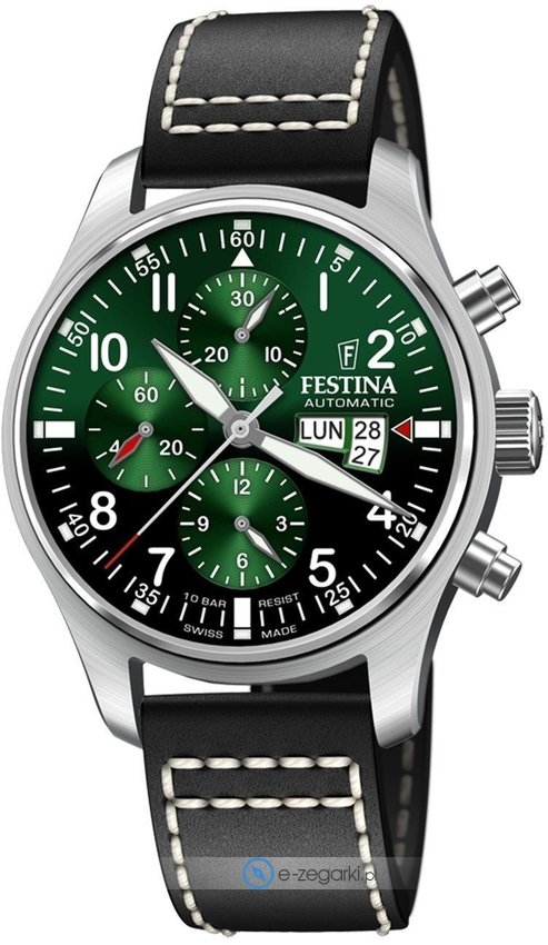 Męski zegarek F20150-4 z kolekcji Festina Swiss Made marki Festina to połączenie estetyki i nieprzeciętnych mechanizmów. Charakter zapewnia wysokiej jakości cyferblat w kolorze zielonym. Zaprezentowana metodą analogową aktualna godzina jest czytelna i łatwa do sprawdzenia. Koperta jest w kolorze srebrnym szeroka jest na 44 mm oraz ma grubość 16 mm - posiada okrągły kształt.