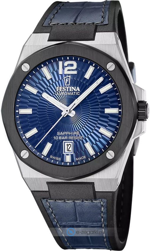 Model męski F22005-2 z serii Festina Swiss Made marki Festina. Charakterystyczny wygląd zegarka osiągnięto m.in. poprzez tarczę w kolorze niebieskim. Zegarek ten pokazuje godzinę w formacie analogowym dzięki temu odczyt jest bezproblemowy. Koperta w odcieniach koloru czarnego szeroka jest na 42 mm oraz ma grubość 11 mm - wyróżnia się okrągłym kształtem.