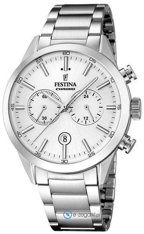 Zegarek męski F16826-1 marki Festina to dobre połączenie funkcjonalności a także modnego wzornictwa. Model ten w gamie innych zegarków tego producenta występuje w serii Festina Timeless Chronograph. Ciekawą stylistykę czasomierza osiągnięto z pomocą tarczy w kolorze srebrnym. Zegarek ten pokazuje godzinę w formacie analogowym dzięki temu odczyt jest bezproblemowy. Koperta w odcieniach koloru srebrnego szeroka jest na 44 mm - posiada okrągły kształt.