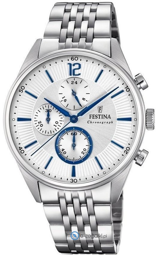 Zegarek męski F20285-1 marki Festina to idealne połączenie funkcjonalności i modnego wzornictwa. Model ten należy do serii Festina Timeless Chronograph. Styl zapewnia wysokiej jakości cyferblat w kolorze srebrnym. Zegarek ten pokazuje godzinę w formacie analogowym dzięki czemu odczyt jest bezproblemowy. Koperta jest ozdobiona kolorem srebrnym szeroka jest na 42 mm oraz ma grubość 11 mm - posiada okrągły kształt.