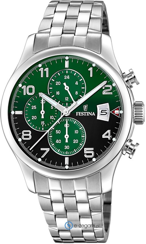 Zegarek męski F20374-7 marki Festina należy do rodziny Festina Timeless Chronograph. Nieschematyczny wygląd zegarka osiągnięto również dzięki tarczy w kolorze zielonym. Pokazana metodą analogową bieżąca godzina jest czytelna i łatwa do sprawdzenia. Koperta w odcieniach koloru srebrnego szeroka jest na 43 mm oraz ma grubość 12 mm - cechuje się okrągłym kształtem.