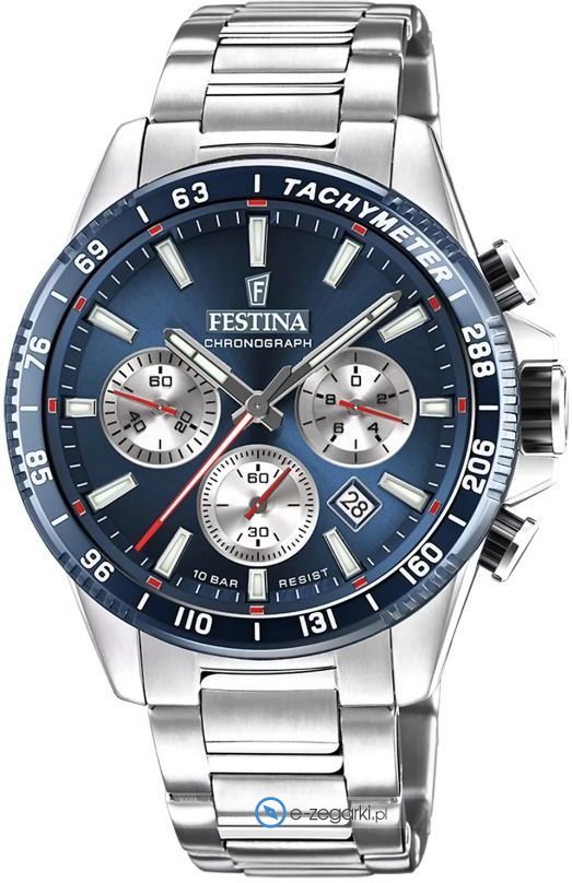 Festina F20560-2 - męski zegarek kierowany dla osób szukających zegarka z kolekcji Festina Timeless Chronograph. Atrakcyjny wygląd czasomierza osiągnięto m.in. poprzez cyferblat w kolorze niebieskim. Zaprezentowana metodą analogową bieżąca godzina jest czytelna i szybka do odczytania. Koperta w odcieniach koloru srebrnego szeroka jest na 45 mm oraz ma grubość 12 mm - w kształcie okrągłym.