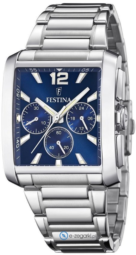 Zegarek F20635-2 marki Festina to gustowny zegarek naręczny męski, który posiada ciekawe rozwiązania oraz funkcje. Model ten należy do kolekcji Festina Timeless Chronograph. Tarcza zegarka jest w kolorze niebieskim. Zegarek ten pokazuje godzinę w formacie analogowym dzięki czemu odczyt jest intuicyjny. Koperta jest w kolorze srebrnym szeroka jest na 38 mm oraz ma grubość 12 mm - w kształcie prostokątnym.