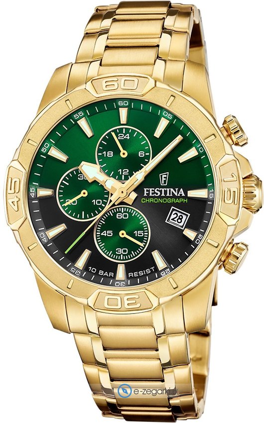 Festina F20705-6 to męski zegarek przeznaczony dla osób szukających zegarka z rodziny Festina Timeless Chronograph. Charakterystyczny wygląd czasomierza uzyskano m.in. poprzez cyferblat w kolorze zielonym. Zegarek ten pokazuje aktualny czas w formacie analogowym dzięki temu odczyt jest bezproblemowy. Koperta jest pokryta kolorem złotym szeroka jest na 45 mm oraz ma grubość 12 mm - posiada okrągły kształt.