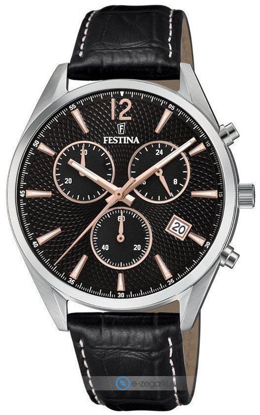 Zegarek męski F6860-7 zalicza się do serii Festina Timeless Chronograph marki Festina. Wysokiej trwałości cyferblat zegarka ozdobiono czarnym kolorem. Godzina prezentowana jest w sposób analogowy co intuicyjnie pozwala ją odczytać. Koperta jest w kolorze srebrnym szeroka jest na 41 mm oraz ma grubość 11 mm - cechuje się okrągłym kształtem.