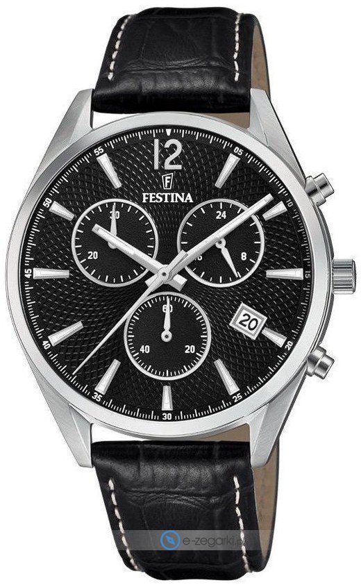 Zegarek męski F6860-8 marki Festina to idealne połączenie funkcjonalności a także ciekawego designu. Model ten jest z serii Festina Timeless Chronograph. Atrakcyjną budowę zegarka osiągnięto dzięki tarczy w kolorze czarnym. Aktualna godzina pokazywana jest w sposób analogowy co niezmiernie łatwo pozwala ją odczytać. Koperta jest w kolorze srebrnym szeroka jest na 41 mm oraz ma grubość 11 mm - w kształcie okrągłym.