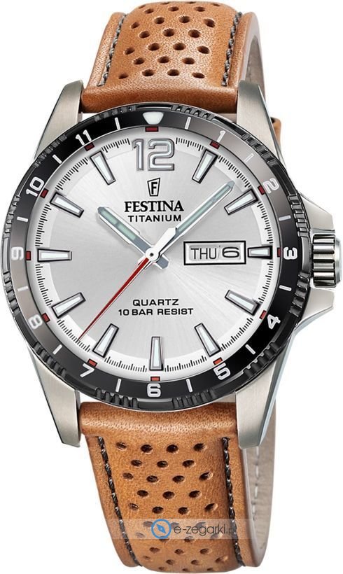Zegarek F20699-1 marki Festina to elegancki zegarek naręczny męski, który jest wyposażony w ciekawe rozwiązania i funkcje. Model ten jest z kolekcji Festina Titanium Date. Charakterystyczną budowę zegarka uzyskano dzięki tarczy w kolorze srebrnym. Aktualna godzina zaprezentowana jest w sposób analogowy co niezmiernie łatwo pozwala ją odczytać. Koperta jest w kolorze szarym szeroka jest na 43 mm oraz ma grubość 11 mm - ma okrągły kształt. Festina tego brandu raczej nie trzeba specjalnie przedstawiać. To lubiana i ceniona praktycznie na całym świecie marka zajmująca się produkcją czasomierzy, która narodziła się początkiem XX wieku w Szwajcarii. Od czasu kiedy marka trafiła do nowej grupy Festina Group w latach 80-tych poprzedniego stulecia stała się bardzo zauważalna. Obecnie zegarki Festina można dostać w przeszło 50 krajach na wszystkich kontynentach. Markę Festina bardzo często można zobaczyć na różnego przekroju imprezach sportowych, np wyścigach kolarskich Tour de Pologne. Wyróżnikiem zgeraków Festina jest posiadanie specjalnie utwardzanego szkiełka mineralnego na które marka udziela osobnej pięcio letniej gwarancji. Współcześnie twarzą marki jest modny i ceniony aktor Gerard Butler, można go zobaczyć w wielu reklamach właśnie z chronometrem Festina.