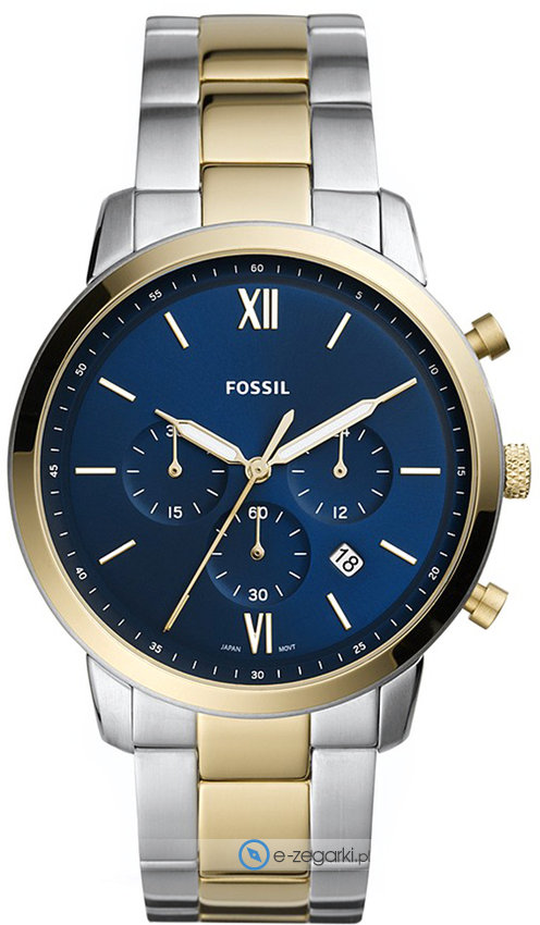Model FS5706 marki Fossil to gustowny zegarek naręczny męski, który wyposażono w ciekawe rozwiązania i funkcje. Ciekawy wygląd zegarka osiągnięto również dzięki tarczy w kolorze niebieskim. Zaprezentowana metodą analogową bieżąca godzina jest czytelna i szybka do odczytania. Koperta w odcieniach koloru srebrno złotego szeroka jest na 44 mm - cechuje się okrągłym kształtem.