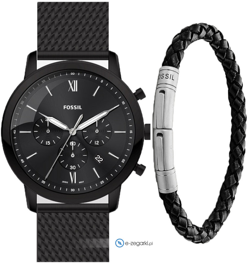 Model FS5786SET marki Fossil to elegancki zegarek naręczny męski, który posiada ciekawe rozwiązania i funkcje. Niestereotypowy wygląd czasomierza uzyskano również dzięki tarczy w kolorze czarnym. Zegarek ten prezentuje godzinę w formacie analogowym dzięki czemu odczyt jest bardzo łatwy. Koperta w barwach koloru czarnego szeroka jest na 44 mm oraz ma grubość 12 mm - cechuje się okrągłym kształtem.
