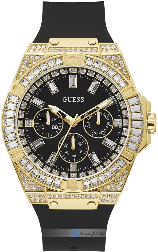 Model GW0208G2 marki Guess to gustowny zegarek naręczny męski, który posiada ciekawe rozwiązania i funkcje. Wysokiej trwałości tarczę zegarka pokryto czarnym kolorem. Godzina pokazywana jest w sposób analogowy co bez trudu pozwala ją odczytać. Koperta jest w kolorze złotym szeroka jest na 47 mm oraz ma grubość 11.35 mm - wyróżnia się okrągłym kształtem.