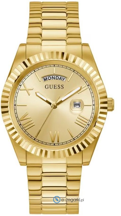 Model GW0265G2 marki Guess to kwintesencja amerykańskiej innowacyjności w świecie zegarmistrzostwa. Ten męski zegarek naręczny, zasilany precyzyjnym mechanizmem kwarcowym, łączy w sobie funkcjonalność i wyrafinowany design. Szampańska tarcza z analogowym odczytem czasu, otoczona złotą kopertą o średnicy 42 mm, zapewnia czytelność i komfort użytkowania. Bransoleta wykonana ze stali nierdzewnej w kolorze złotym gwarantuje trwałość i odporność na czynniki zewnętrzne. Zegarki Guess to odrobina luksusu oraz elegancji na ręku właściciela, zegarki te dzięki wyjątkowym akcentom podkreślają swój styl, cechują się ponadto gustowną elegancją i funkcjonalnością na najwyższym poziomie. Zegarek GW0265G2 posiada kwarcowy mechanizm zasilany klasyczną baterią. Odporna na korozję oraz oddziaływanie czynników atmosferycznych bransoleta w tonacji koloru złotego cechuje się jakością, a także trwałością. Kopertę zrobiono ze stali nierdzewnej która posiada odporność na korozję oraz działanie czynników atmosferycznych.