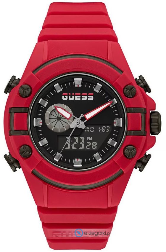 Męski zegarek Guess GW0269G5 to zegarek, który dzięki swemu wzornictwu zawsze będzie prezentował się dobrze. Niestereotypowy wygląd zegarka osiągnięto m.in. poprzez tarczę w kolorze czarnym. Aktualna godzina zaprezentowana jest w sposób analogowo - cyfrowy co niezmiernie łatwo pozwala ją odczytać. Koperta jest pokryta kolorem czerwonym szeroka jest na 47 mm - ma okrągły kształt.