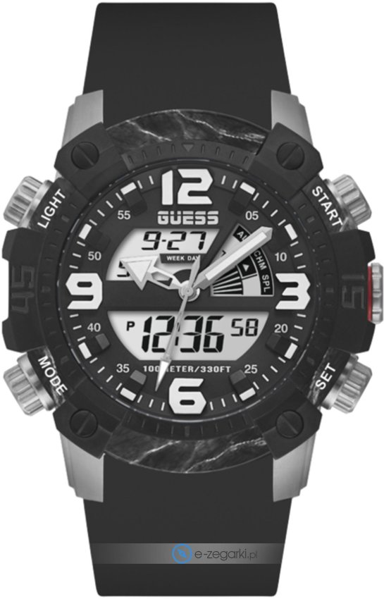 Zegarek męski GW0421G1 marki Guess to propozycja dla mężczyzn ceniących sobie dbałość o detale oraz niezawodność. Czarna tarcza prezentuje godzinę w formacie analogowo-cyfrowym, co ułatwia odczyt. Koperta o szerokości 50 mm i grubości 18 mm, również w kolorze czarnym, ma okrągły kształt.