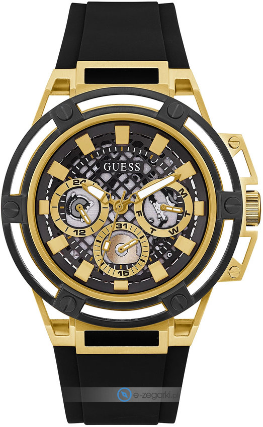 Zegarek męski GW0423G2 marki Guess to dobre połączenie funkcjonalności i modnego designu. Charakterystyczny wygląd czasomierza uzyskano m.in. poprzez tarczę w kolorze czarnym. Zegarek ten prezentuje godzinę w formacie analogowym dzięki temu odczyt jest bardzo łatwy. Koperta została pokryta kolorem złotym szeroka jest na 46 mm oraz ma grubość 12 mm - posiada okrągły kształt.