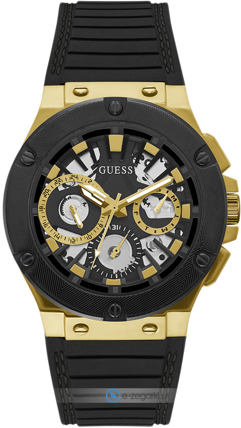 Model GW0487G5 marki Guess to elegancki zegarek naręczny męski, który jest wyposażony w ciekawe rozwiązania i funkcje. Niestereotypowy wygląd zegarka uzyskano m.in. poprzez tarczę w kolorze czarnym. Zegarek ten prezentuje aktualny czas w formacie analogowym dzięki temu odczyt jest bezproblemowy. Koperta jest w kolorze złotym szeroka jest na 44 mm oraz ma grubość 11 mm - wyróżnia się okrągłym kształtem.