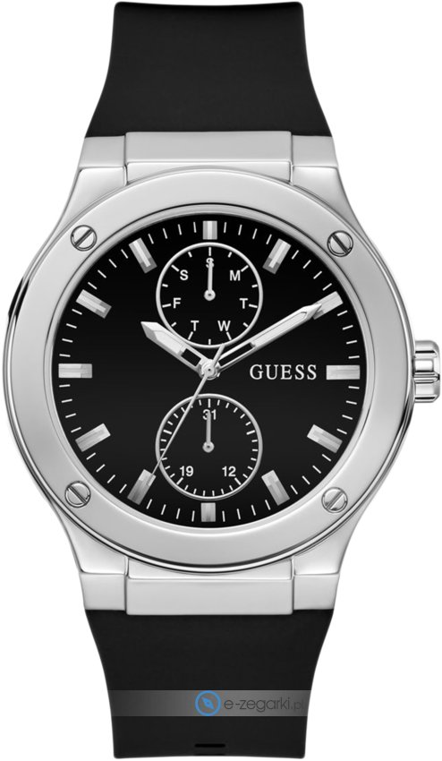 Model GW0491G3 marki Guess to stylowy zegarek naręczny męski, który wyposażono w ciekawe rozwiązania i funkcje. Tarcza zegarka jest w kolorze czarnym. Zegarek ten pokazuje aktualny czas w formacie analogowym dzięki temu odczyt jest bardzo łatwy. Koperta jest w kolorze srebrnym szeroka jest na 45 mm oraz ma grubość 11 mm - charakteryzuje się okrągłym kształtem.