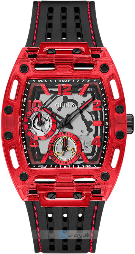 Zegarek męski GW0499G4 marki Guess to dobre połączenie funkcjonalności i modnego wzornictwa. Niebanalną budowę zegarka osiągnięto z pomocą tarczy w kolorze srebrnym. Aktualna godzina pokazywana jest w sposób analogowy co niezmiernie łatwo pozwala ją odczytać. Koperta w barwach koloru czerwonego szeroka jest na 44 mm.