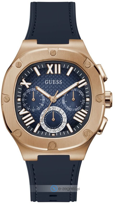Męski zegarek Guess GW0571G2 to zegarek, który dzięki swemu wzornictwu zawsze będzie prezentował się dobrze. Wysokiej trwałości cyferblat zegarka pokryto niebieskim kolorem. Godzina zaprezentowana jest w sposób analogowy co bez trudu pozwala ją odczytać. Koperta jest w kolorze różowo złotym szeroka jest na 42 mm - w kształcie okrągłym.