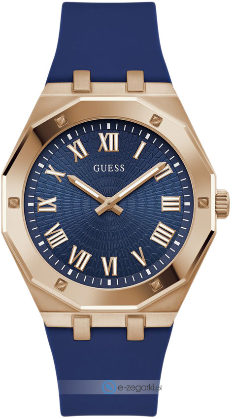 Zegarek męski GW0663G3 marki Guess to idealne połączenie funkcjonalności i modnego designu. Tarcza zegarka jest w kolorze niebieskim. Godzina zaprezentowana jest w sposób analogowy co bez trudu pozwala ją odczytać. Koperta w odcieniach koloru różowo złotego szeroka jest na 43 mm oraz ma grubość 10 mm.