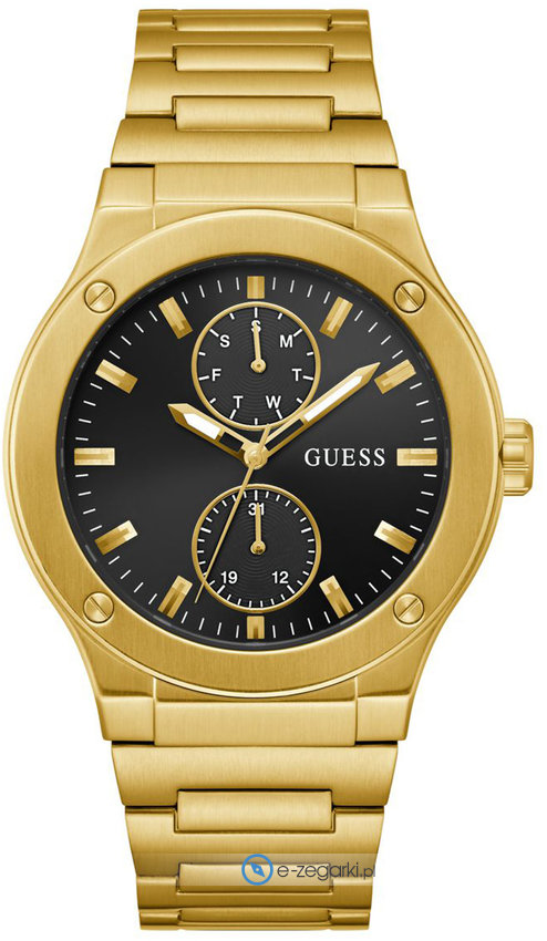 Męski zegarek Guess GW0795G4 to zegarek, który dzięki swemu wzornictwu zawsze będzie prezentował się dobrze. Atrakcyjną stylistykę zegarka osiągnięto dzięki tarczy w kolorze czarnym. Zaprezentowana metodą analogową aktualna godzina jest czytelna i szybka do sprawdzenia. Koperta jest pokryta kolorem złotym szeroka jest na 43 mm oraz ma grubość 11 mm - charakteryzuje się okrągłym kształtem.