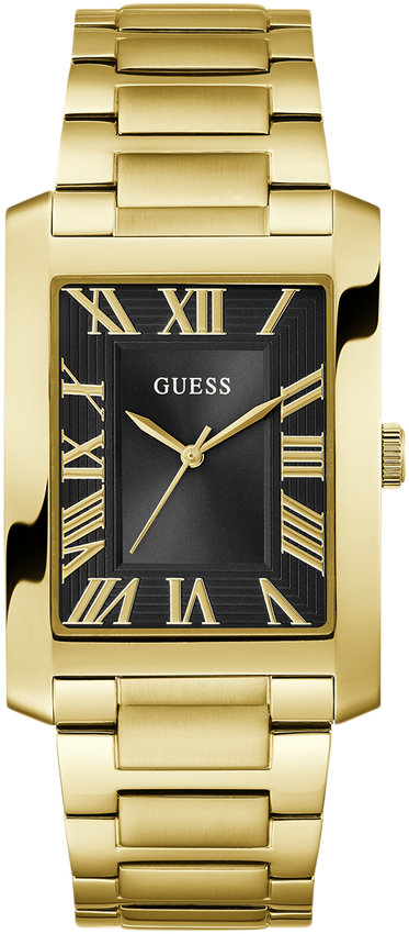 Model GW0896G2 marki Guess to gustowny zegarek naręczny męski, który jest wyposażony w ciekawe rozwiązania i funkcje. Niebanalny wygląd zegarka osiągnięto m.in. poprzez tarczę w kolorze czarnym. Zegarek ten pokazuje aktualny czas w formacie analogowym dzięki temu odczyt jest bardzo łatwy. Koperta jest ozdobiona kolorem złotym - w kształcie prostokątnym.