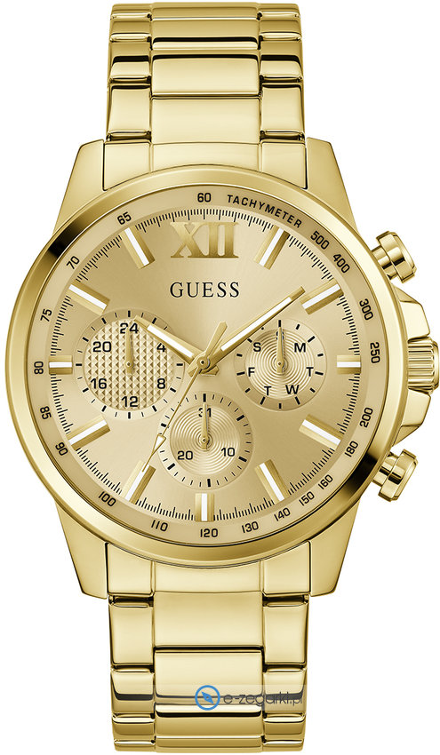 Model GW0900G2 marki Guess to elegancki zegarek naręczny męski, który wyposażono w ciekawe rozwiązania oraz funkcje. Niebanalną konstrukcję zegarka uzyskano z pomocą tarczy w kolorze złotym. Godzina pokazywana jest w sposób analogowy co bez trudu pozwala ją odczytać. Koperta jest ozdobiona kolorem złotym szeroka jest na 44 mm oraz ma grubość 11 mm - charakteryzuje się okrągłym kształtem.