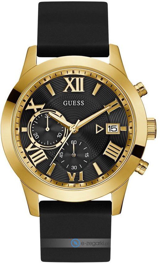 Zegarek męski W1055G4 marki Guess to dobre połączenie funkcjonalności a także ciekawego designu. Wysokiej jakości tarczę zegarka pokryto czarnym kolorem. Aktualna godzina zaprezentowana jest w sposób analogowy co intuicyjnie pozwala ją odczytać. Koperta została ozdobiona kolorem srebrnym szeroka jest na 45 mm oraz ma grubość 13 mm - w kształcie okrągłym.