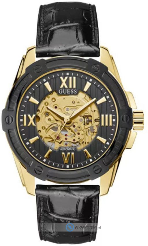 Zegarek męski W1308G2 marki Guess to stylowe połączenie funkcjonalności i ciekawego designu. Styl zapewnia wysokiej klasy cyferblat w kolorze czarnym. Aktualna godzina prezentowana jest w sposób analogowy co intuicyjnie pozwala ją odczytać. Koperta jest pokryta kolorem złotym szeroka jest na 45 mm - charakteryzuje się okrągłym kształtem.