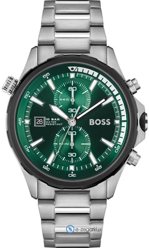 Model 1513930 marki Hugo Boss to gustowny zegarek naręczny męski, który posiada ciekawe rozwiązania oraz funkcje. Ciekawą budowę zegarka uzyskano z pomocą tarczy w kolorze zielonym. Aktualna godzina przedstawiona jest w sposób analogowy co bez trudu pozwala ją odczytać. Koperta jest w kolorze srebrnym szeroka jest na 46 mm oraz ma grubość 11 mm - w kształcie okrągłym.