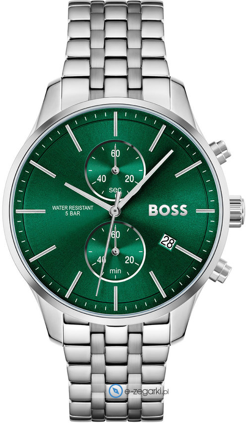 Męski zegarek Hugo Boss 1513975 to zegarek, który dzięki swemu wzornictwu zawsze będzie prezentował się dobrze. Nieschematyczny wygląd czasomierza uzyskano m.in. poprzez cyferblat w kolorze zielonym. Zaprezentowana metodą analogową aktualna godzina jest czytelna i łatwa do sprawdzenia. Koperta jest pokryta kolorem szarym szeroka jest na 42 mm oraz ma grubość 7 mm - w kształcie okrągłym.