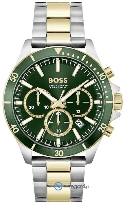 Męski zegarek Hugo Boss 1514154 to zegarek, który dzięki swemu wzornictwu zawsze będzie prezentował się dobrze. Wysokiej jakości cyferblat zegarka ozdobiono zielonym kolorem. Zegarek ten pokazuje godzinę w formacie analogowym dzięki temu odczyt jest bardzo łatwy. Koperta jest w kolorze szarym szeroka jest na 44 mm - ma okrągły kształt.