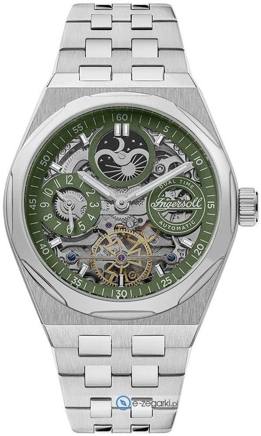 Model I12905 marki Ingersoll to gustowny zegarek naręczny męski, który wyposażono w ciekawe rozwiązania oraz funkcje. Tarcza zegarka jest w kolorze zielonym. Zegarek ten pokazuje aktualny czas w formacie analogowym dzięki temu odczyt jest intuicyjny. Koperta jest pokryta kolorem srebrnym szeroka jest na 43 mm - posiada okrągły kształt.
