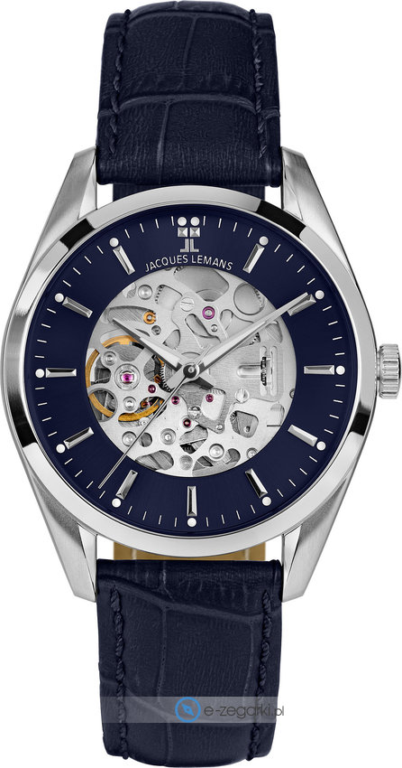 Model męski JL 1-2087C z serii Jacques Lemans Derby marki Jacques Lemans. Nieschematyczny wygląd zegarka uzyskano m.in. poprzez cyferblat w kolorze granatowym. Zaprezentowana metodą analogową bieżąca godzina jest czytelna i prosta do sprawdzenia. Koperta jest pokryta kolorem srebrnym szeroka jest na 40 mm - w kształcie okrągłym.