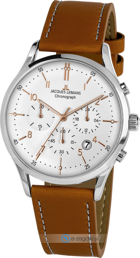 Model JL 1-2068P marki Jacques Lemans to gustowny zegarek naręczny męski, który jest wyposażony w ciekawe rozwiązania oraz funkcje. Charakter zapewnia wysokiej jakości cyferblat w kolorze jasnym. Zaprezentowana metodą analogową aktualna godzina jest czytelna i szybka do odczytania. Koperta w barwach koloru srebrnego szeroka jest na 41 mm oraz ma grubość 14 mm - ma okrągły kształt.