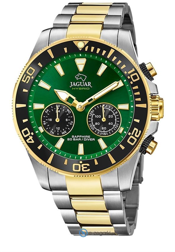Zegarek męski J889-3 marki Jaguar to stylowe połączenie funkcjonalności i modnego designu. Niebanalny wygląd czasomierza osiągnięto m.in. poprzez cyferblat w kolorze zielonym. Pokazana metodą analogową aktualna godzina jest czytelna i łatwa do sprawdzenia. Koperta została ozdobiona kolorem srebrno złotym szeroka jest na 46 mm - w kształcie okrągłym.