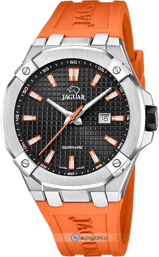 Zegarek męski J1010-1 marki Jaguar to ciekawa propozycja dla osób ceniących sobie dbałość o detale a także bezawaryjne funkcjonowanie mechanizmów. Nieschematyczny wygląd zegarka uzyskano również dzięki tarczy w kolorze czarnym. Zaprezentowana metodą analogową bieżąca godzina jest czytelna i łatwa do sprawdzenia. Koperta szeroka jest na 44 mm - w kształcie okrągłym.
