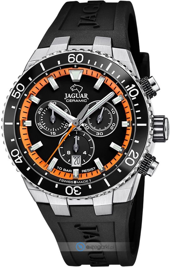 Model J1021-4 marki Jaguar to elegancki zegarek naręczny męski, który wyposażono w ciekawe rozwiązania oraz funkcje. Wysokiej trwałości tarczę zegarka pokryto czarnym kolorem. Aktualna godzina pokazywana jest w sposób analogowy co bez trudu pozwala ją odczytać. Koperta szeroka jest na 44 mm - w kształcie okrągłym.