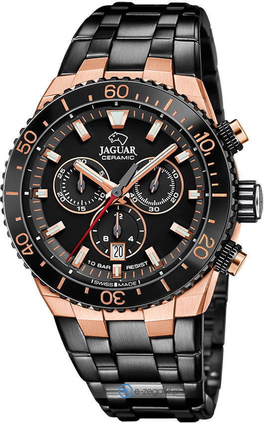 Męski zegarek Jaguar J1023-1 to zegarek, który dzięki swemu wzornictwu zawsze będzie prezentował się dobrze. Ciekawą budowę czasomierza osiągnięto dzięki tarczy w kolorze czarnym. Zaprezentowana metodą analogową aktualna godzina jest czytelna i szybka do sprawdzenia. Koperta jest w kolorze różowo złotym szeroka jest na 45 mm oraz ma grubość 13 mm - w kształcie okrągłym.